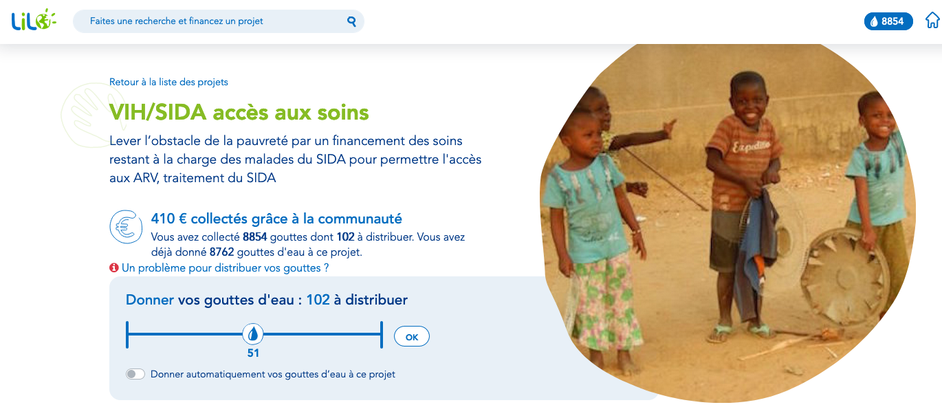 En attribuant vos gouttes à ce projet, vous contribuerez à la lutte contre le SIDA. La collecte de fonds permettra de financer les frais médicaux de PVVIH dont le niveau de pauvreté fait obstacle à l’accès aux soins. Sans aucun frais pour vous, vous contribuerez ainsi au financement de ce projet.